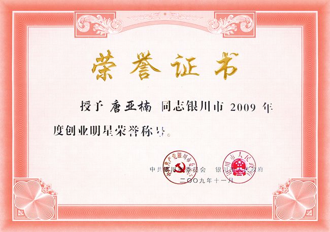 唐亞楠被評(píng)為2009年度創(chuàng)業(yè)明星稱號(hào)